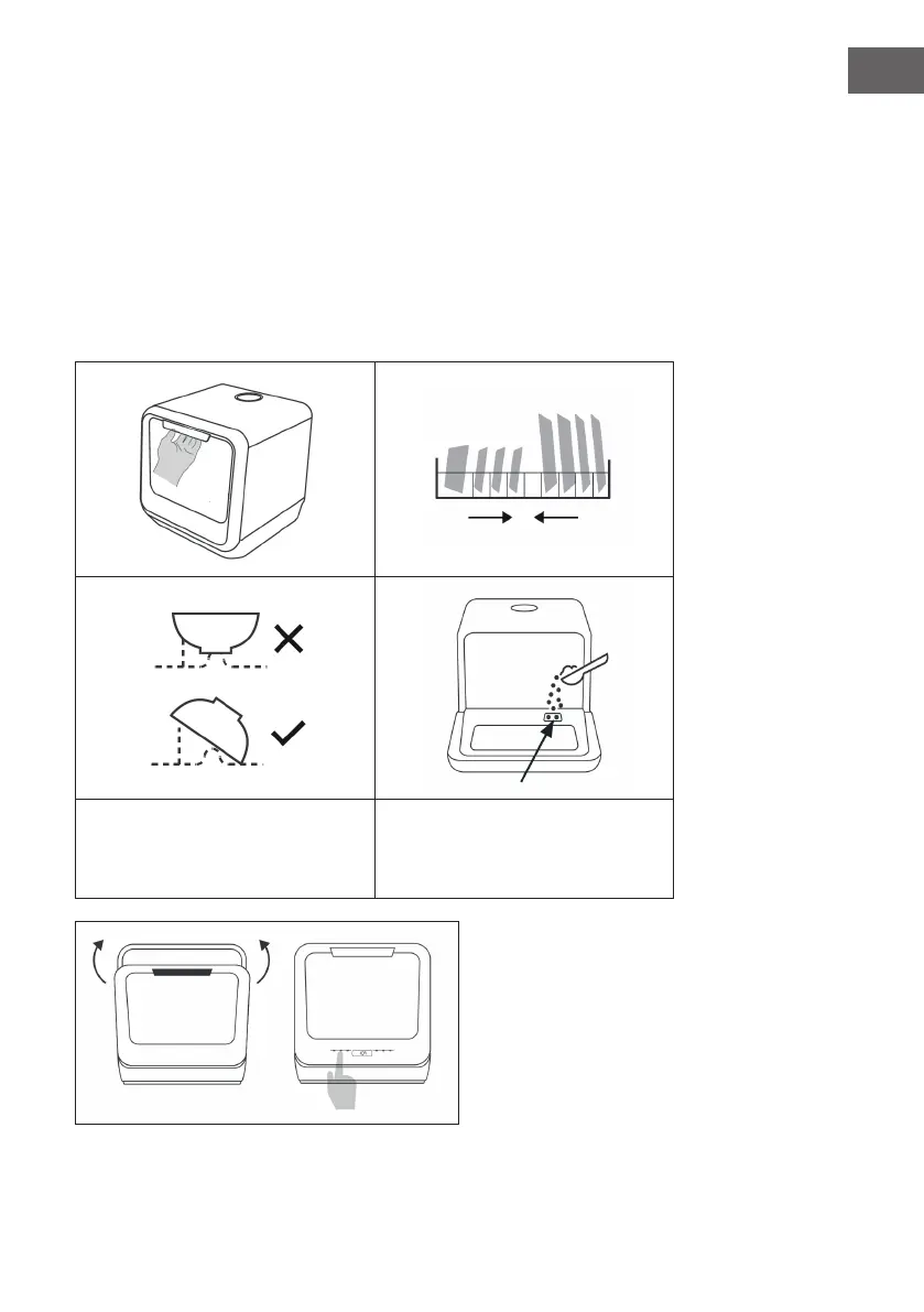 Abra la puerta, coloque la vajilla en el cesto y añada lavavajillas.