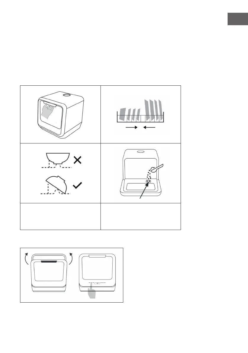 Aprire lo sportello, mettere le stoviglie nel cestello e aggiungere il detersivo.