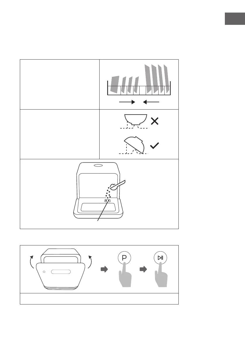 • Öffnen Sie die Tür, stellen Sie das Geschirr in den Korb und fügen Sie Spülmittel