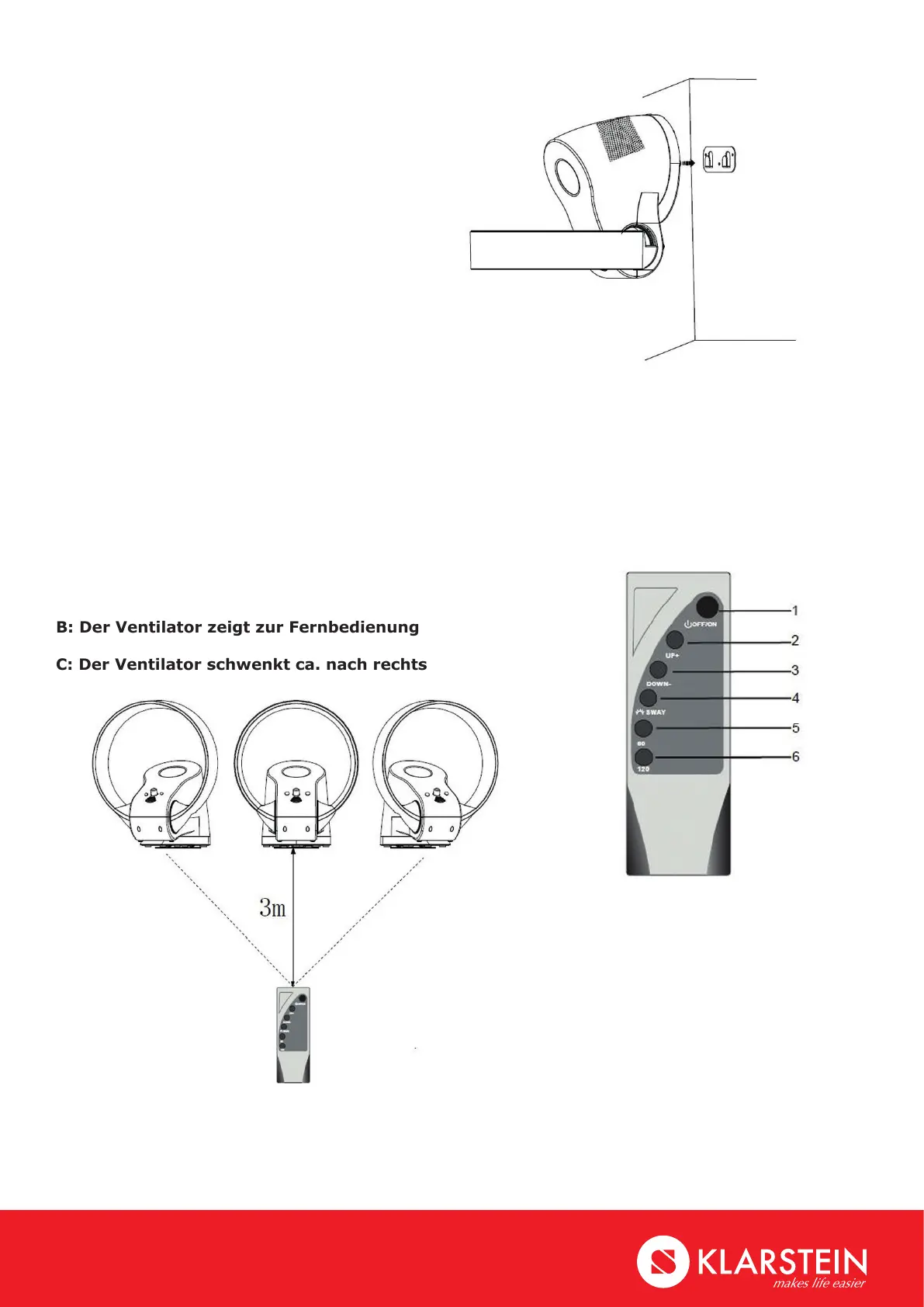 B: Der Ventilator zeigt zur Fernbedienung