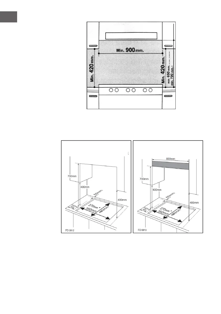 mindestens 700 mm von der Kochplatte entfernt sein sollte, wie in der Abbildung