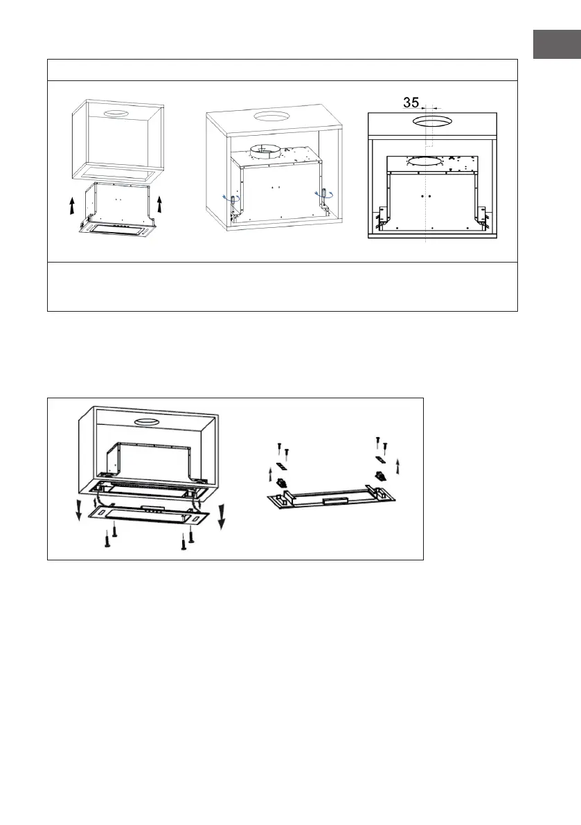 Slide the cooker hood into the cabinet housing. Tighten the screws from the top. Note for the outlet hole in