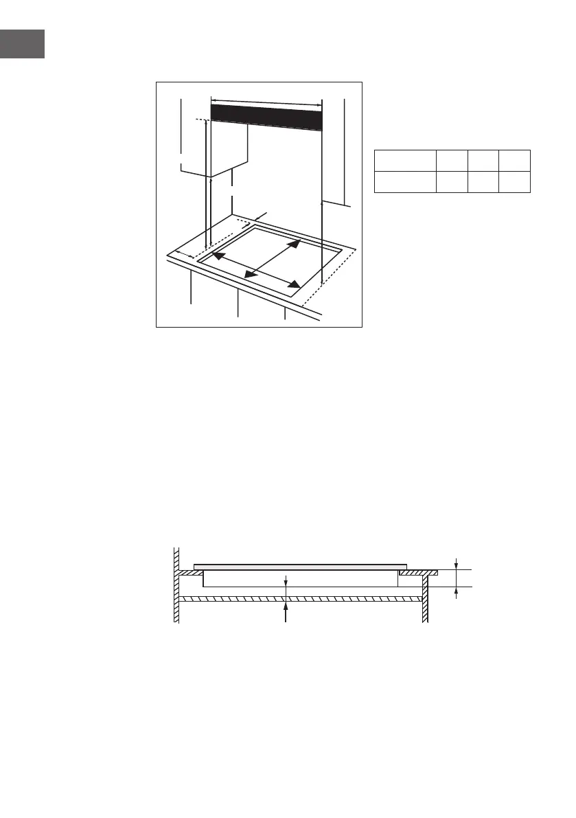 • I bordi del piano cottura devono avere 60 mm di distanza da pareti laterali e