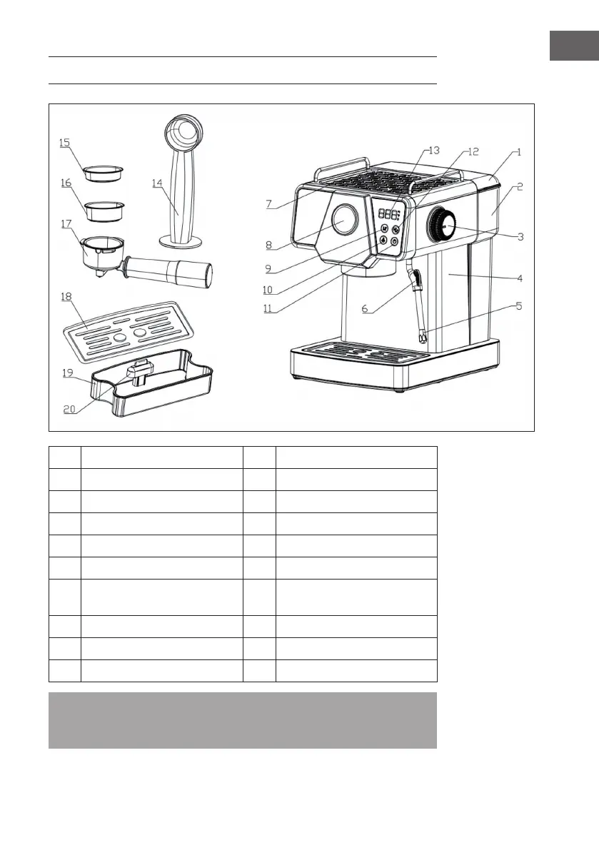 5 Tubo y boquilla de vapor 15 Filtro de café simple