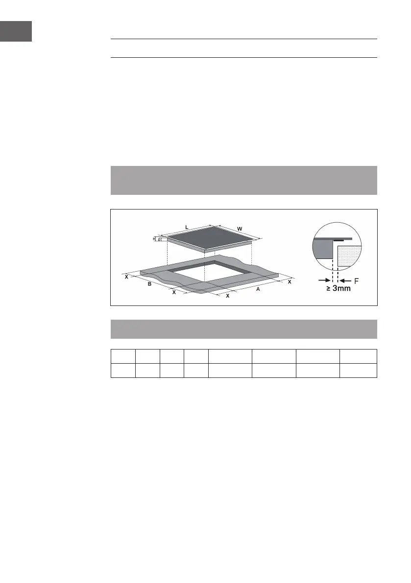Note: The safety distance between the sides of the hob and the inner surfaces