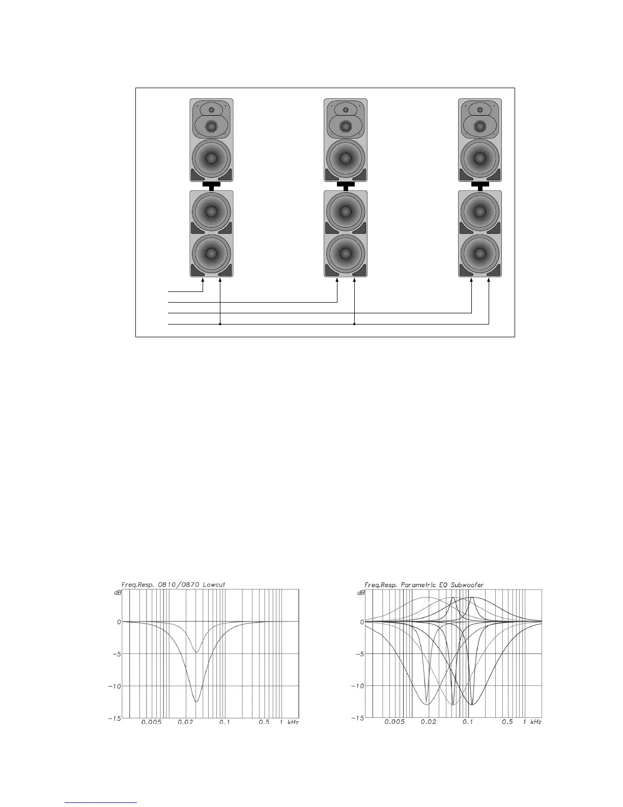 subwoofers, using XLR “Y” cables, and the signal level adjusted at the source by -9.5 dB or +0.5 dB so that the