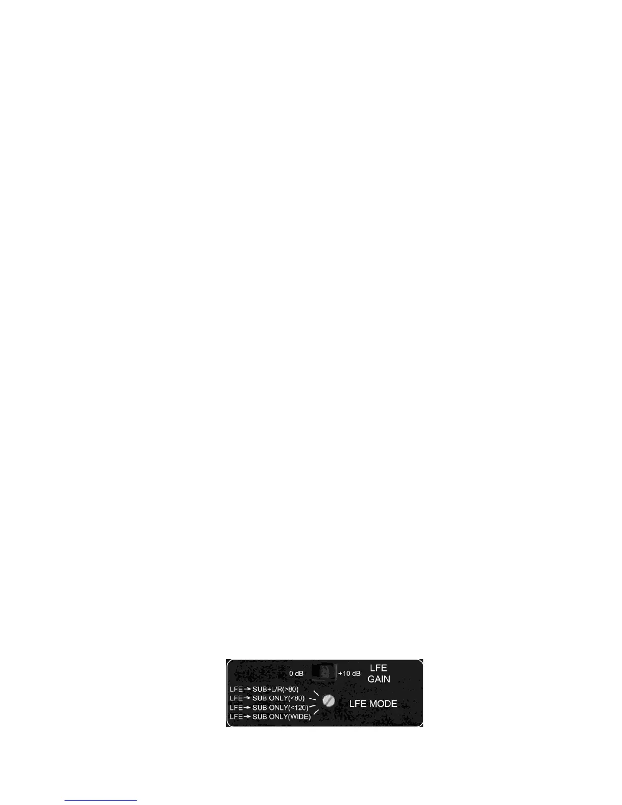 LFE Mode-Schalter verfügt über vier Einstellungen (voreingestellt ist LFE → SUB + L/R (>80)), die den LFE-