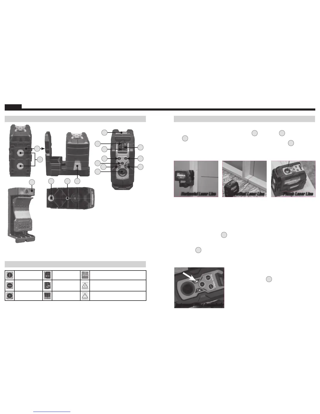 (93LCLS model only) to turn ON and OFF their respective laser lines. These