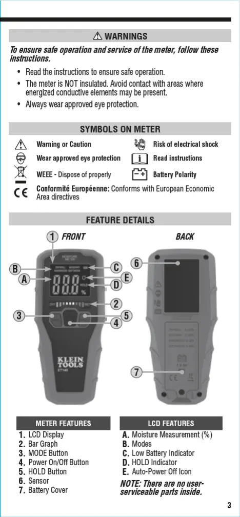 Klein Tools ET140 - Safety and Symbols; Safety Warnings; Meter Symbols Explained; Device Features