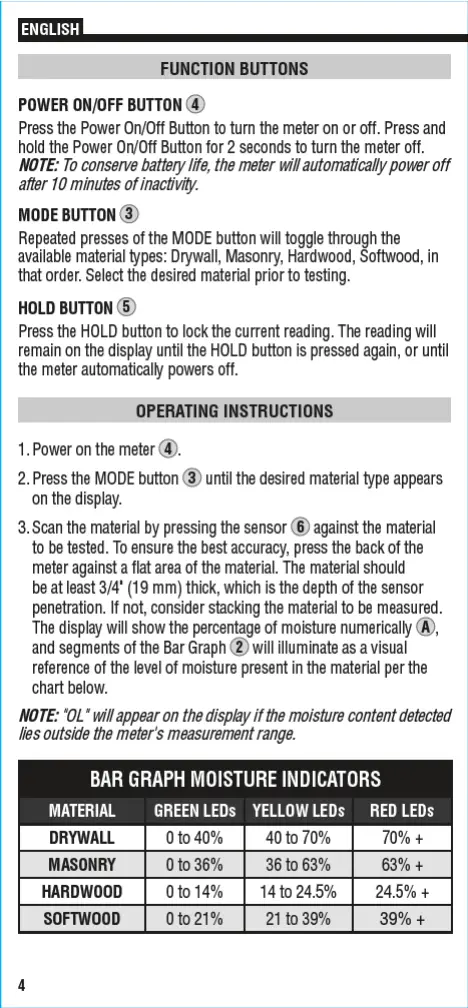 Klein Tools ET140 - Function Buttons and Operation; Function Buttons; Operating Instructions; Bar Graph Moisture Indicators