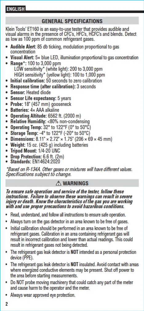 Klein Tools ET160 - General Specifications and Warnings; Product Specifications; Safety Precautions