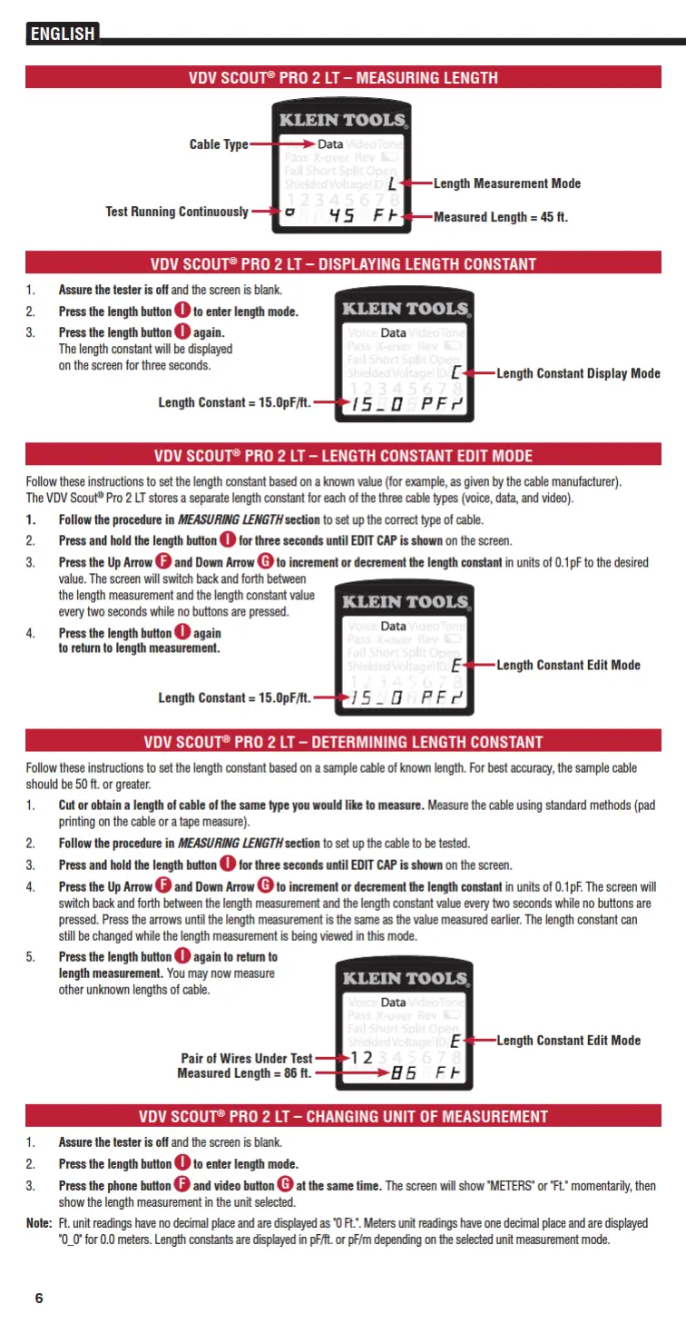 Klein Tools VDV Scout Pro 2 - VDV SCOUT PRO 2 LT LENGTH OPERATIONS; DISPLAYING AND EDITING CONSTANTS; DETERMINING AND UNIT CONVERSION