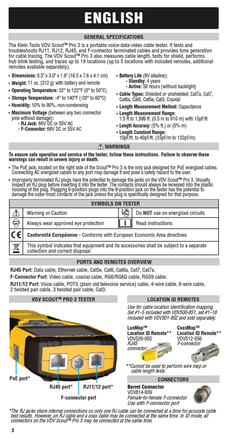 Klein Tools VDV501-853 - General Specifications and Features; Device Specifications and Operation; Length Measurement Capabilities; Safety and Operation Guidelines