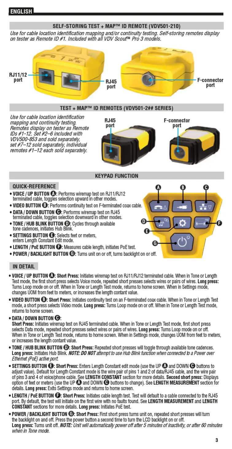 Klein Tools VDV501-853 - Keypad Functionality; Quick Reference for Buttons; Detailed Button Operation