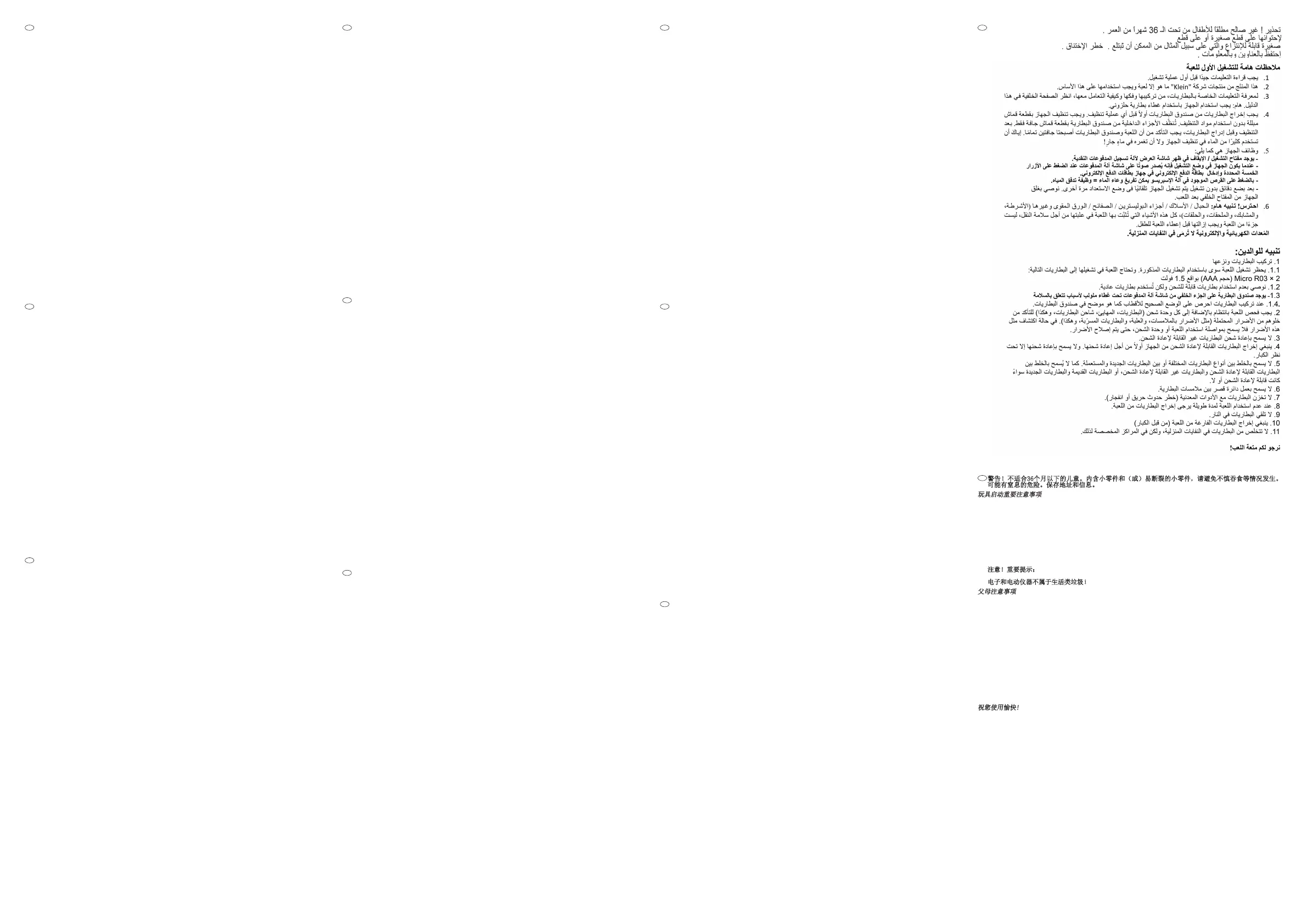 1.1 Do této hračky je možné vkládat pouze přiložené baterie. Na provoz výrobku jsou třeba tyto baterie: 2 x Micro R03 (AAA) po 1,5 V.