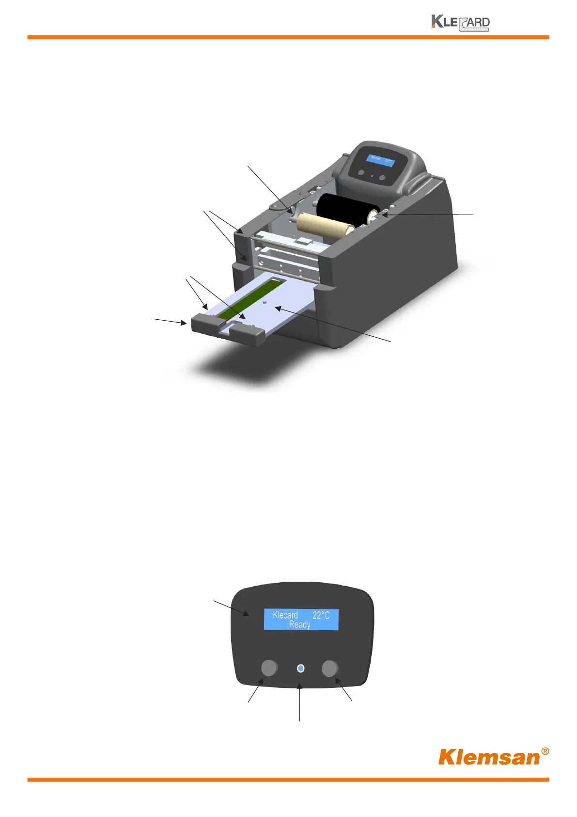 A serial 2x16 character LCD display is present on the Klecard. The on/off push button is