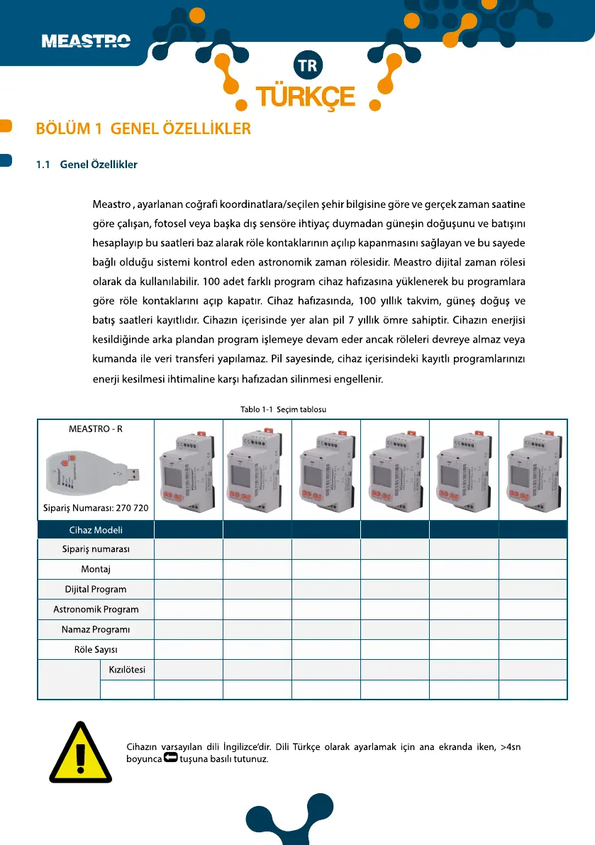 Klemsan Meastro-R - Genel Özellikler; TABLOLAR 1.1 SeçIM Tablosu
