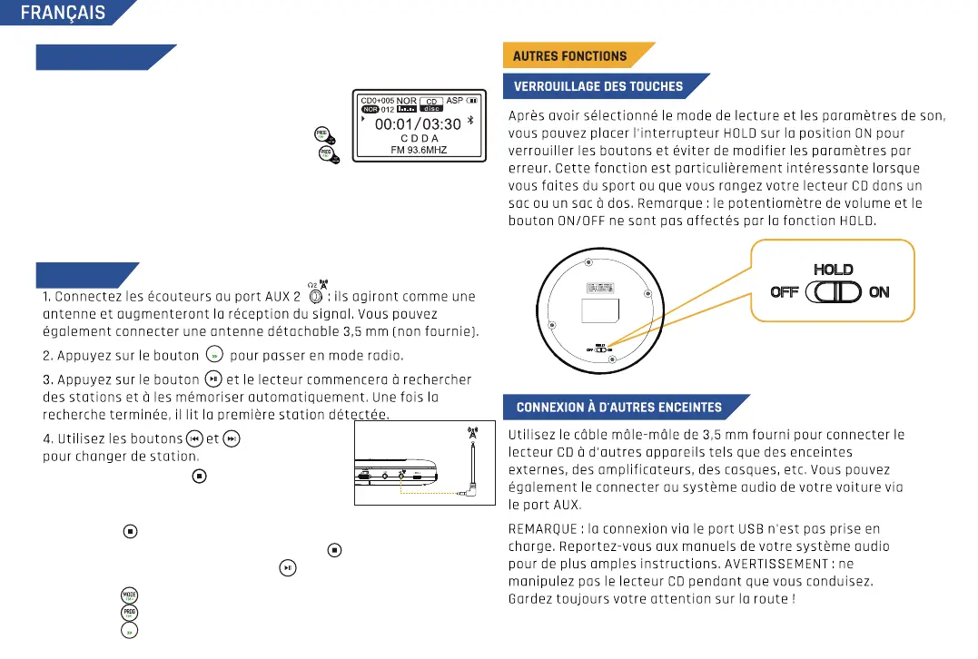 Note : En mode FM, un appui long sur le bouton éteindra le lecteur CD.