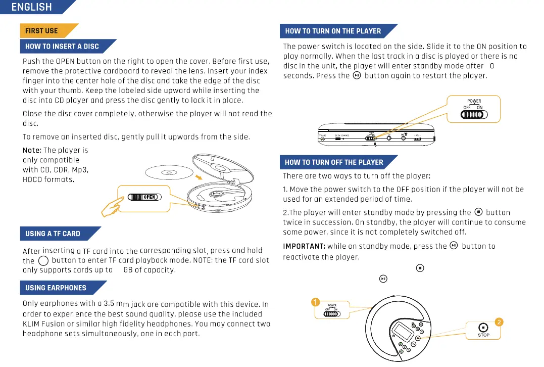 KLIM Discover - First Use and Operation; Inserting and Removing Discs; Turning the Player On; Turning the Player Off