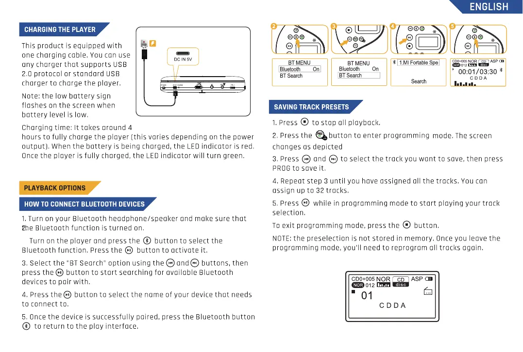 KLIM Discover - Charging and Connectivity; Charging the Player; Connecting Bluetooth Devices; Saving Track Presets