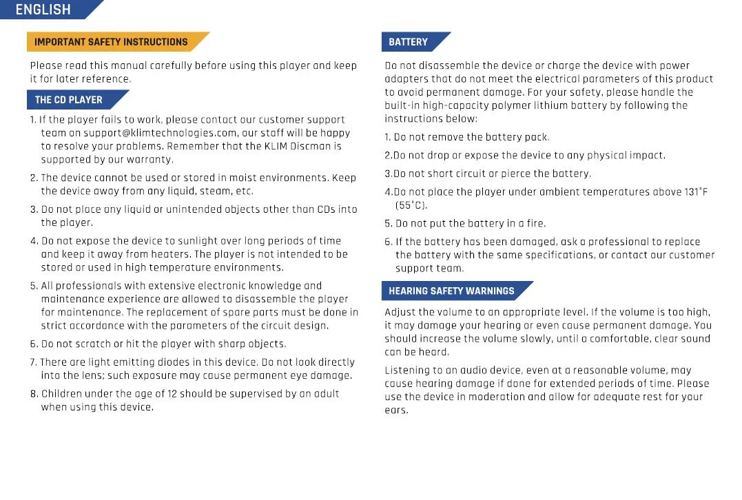 KLIM Journey - IMPORTANT SAFETY INSTRUCTIONS; CD Player Safety; Battery Safety; Hearing Safety Warnings