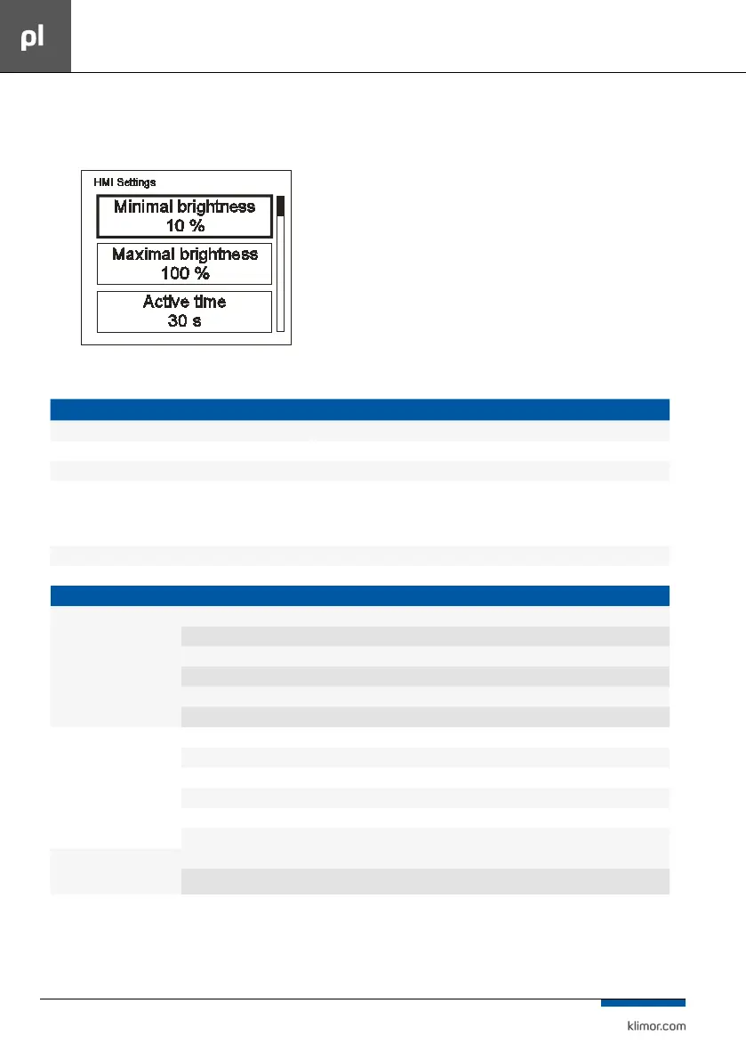 Minimal brightness (Minimalna jasność) Moc podświetlenia gdy HMI przechodzi w tryb gotowości