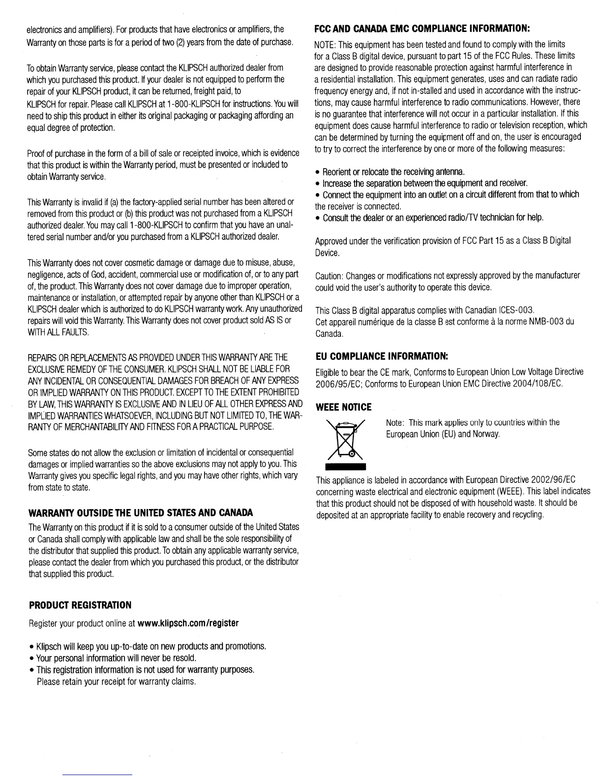 Klipsch KW-100 - Warranty Outside US & Canada; Product Registration; FCC & Canada EMC Compliance; EU Compliance Information