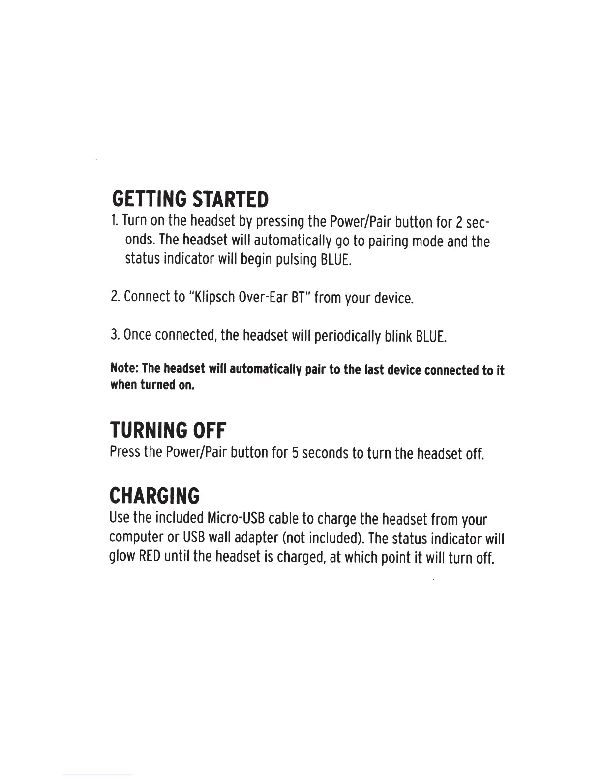 Klipsch ON-EAR BLUETOOTH - Getting Started; Turning off; Charging