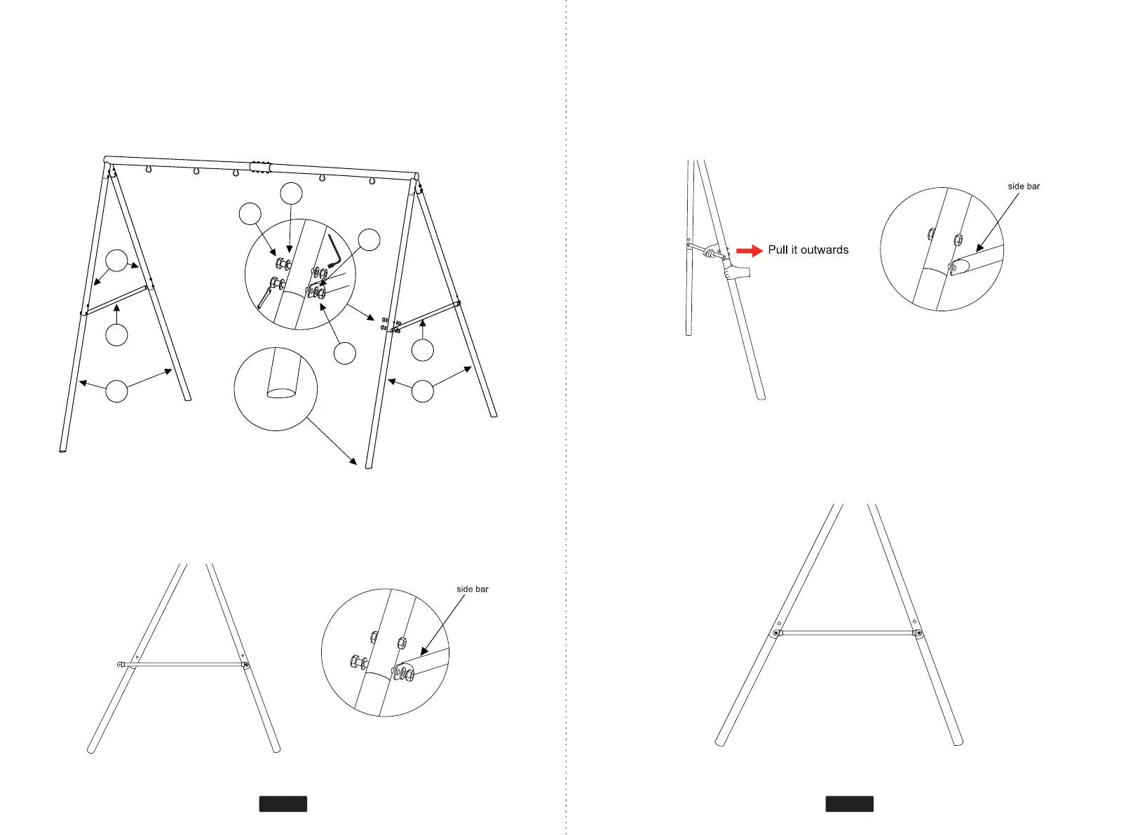 1) Hold the other leg tube and pull it outwards until the bar hole align to the LOWER