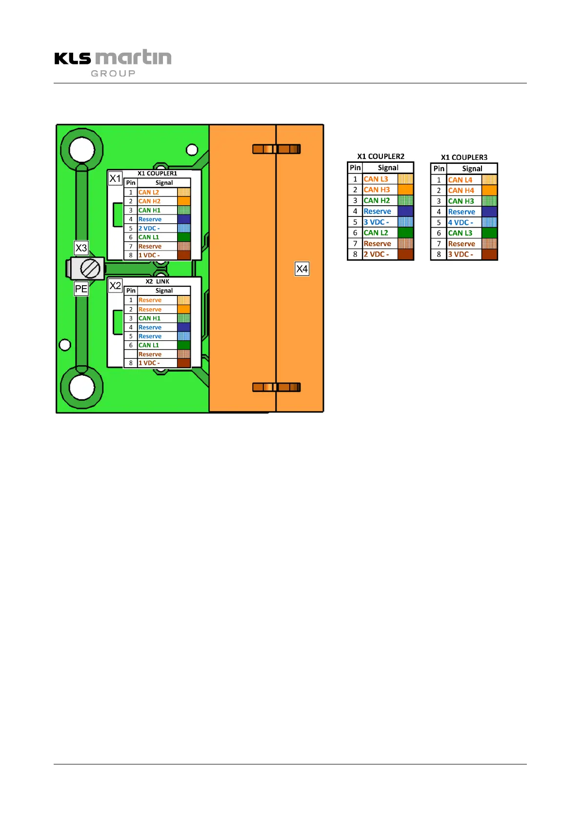 The above diagram shows the pin assignments for bus coupler 1. The signal assignments for coupler 2 and