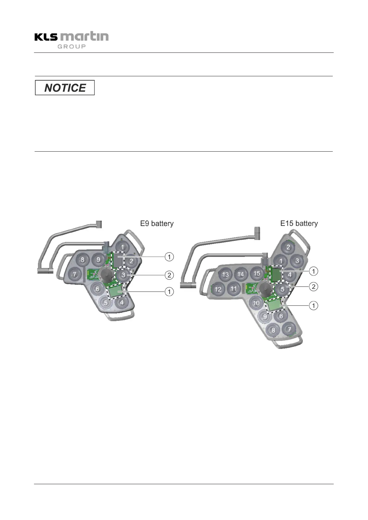 Fig. 9-3: Positions of battery packs (1) and light engine over the battery connector (2)