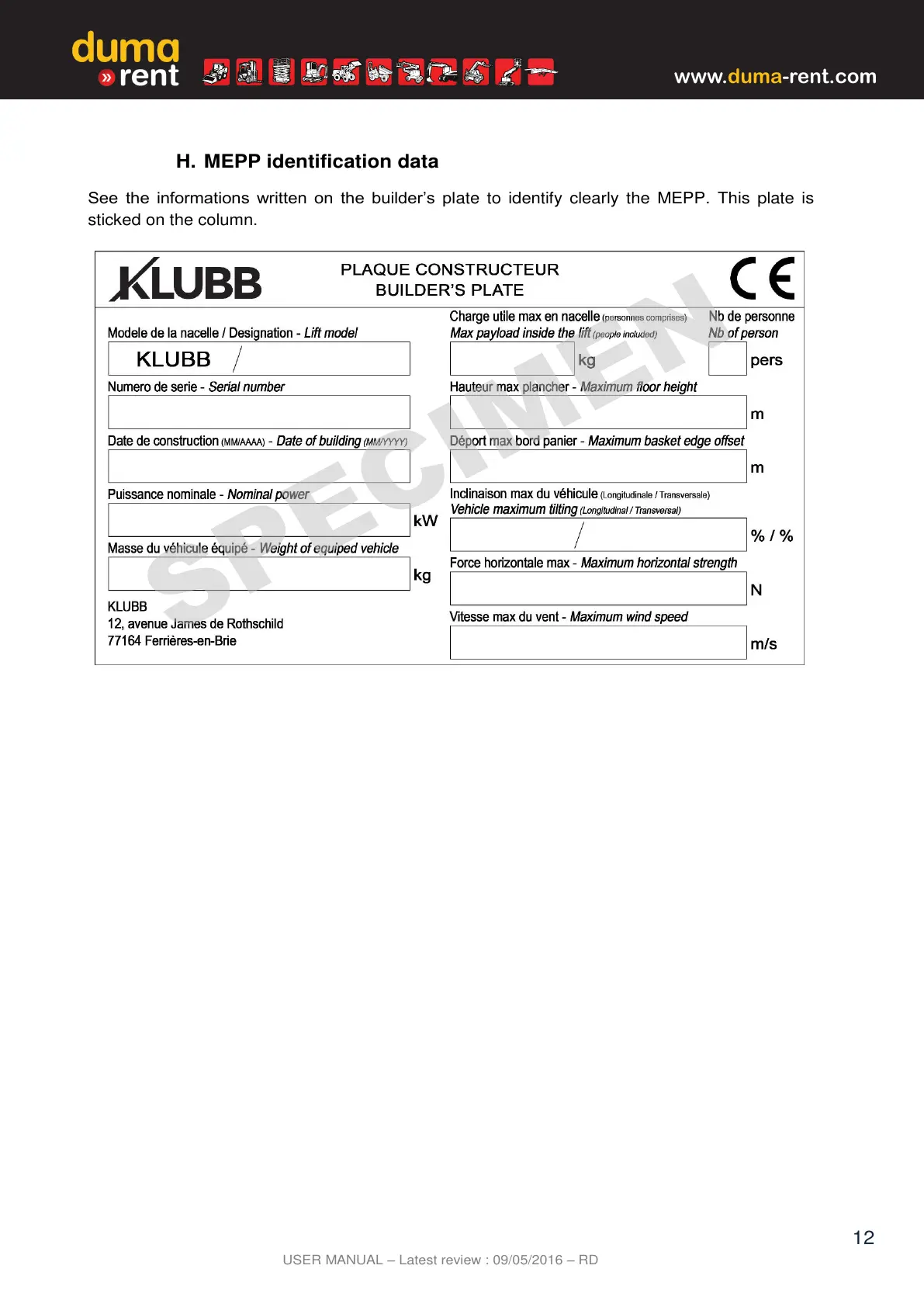 See the informations written on the builders plate to identify clearly the MEPP. This plate is