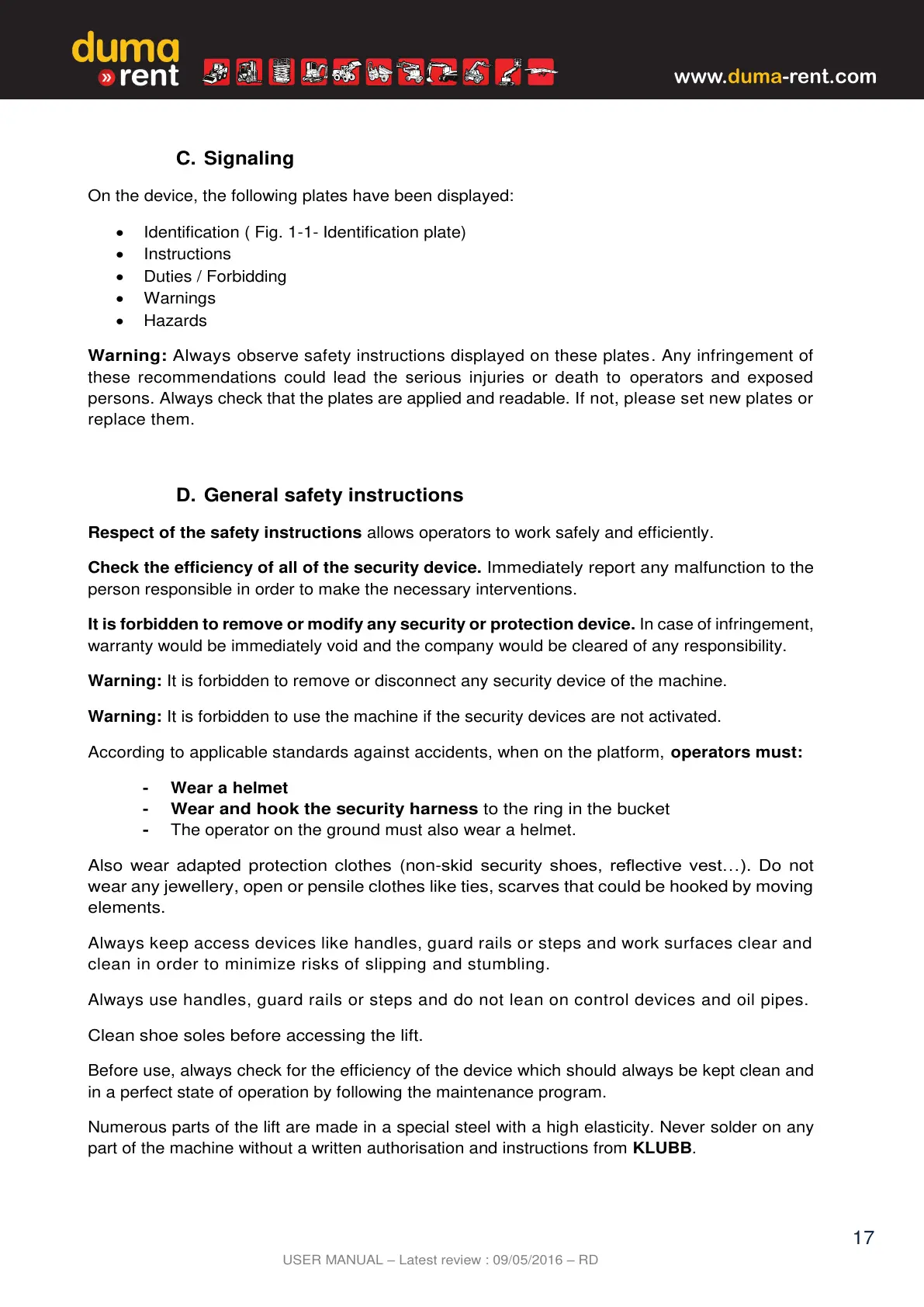 Respect of the safety instructions allows operators to work safely and efficiently.