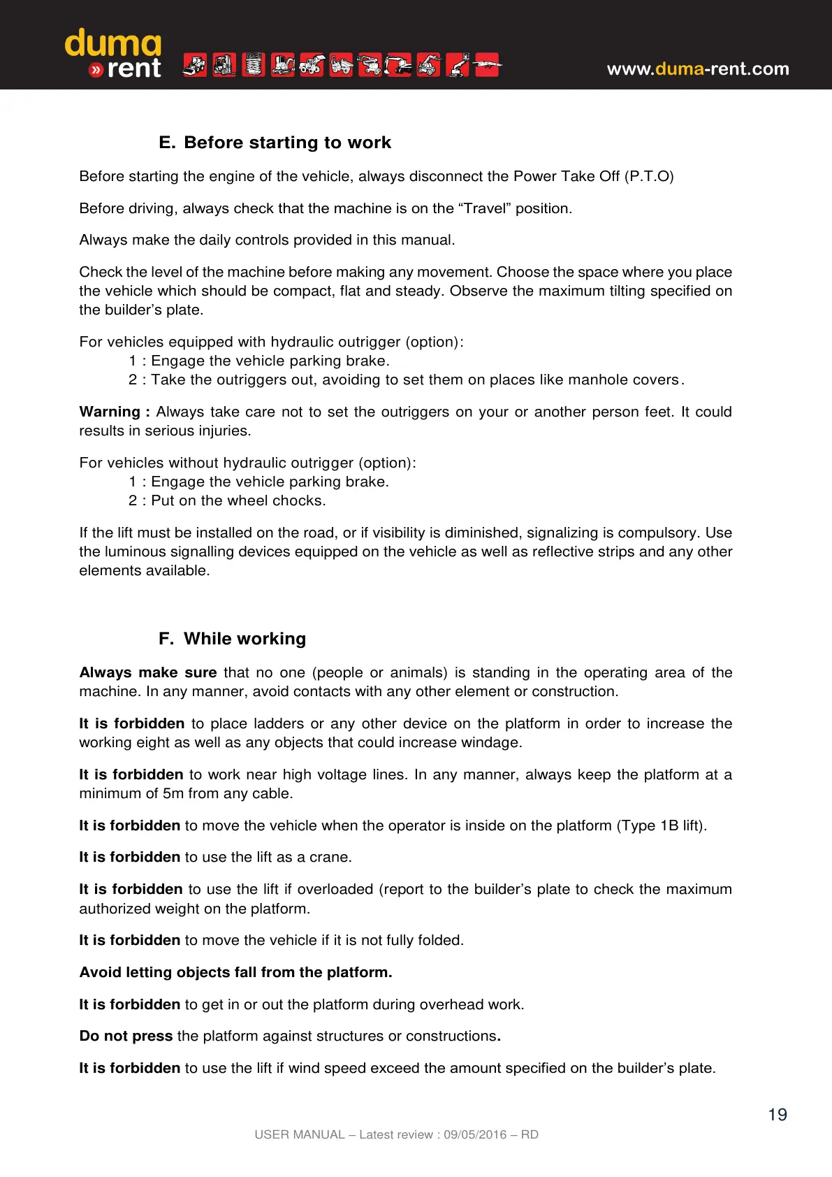 It is forbidden to move the vehicle when the operator is inside on the platform (Type 1B lift).