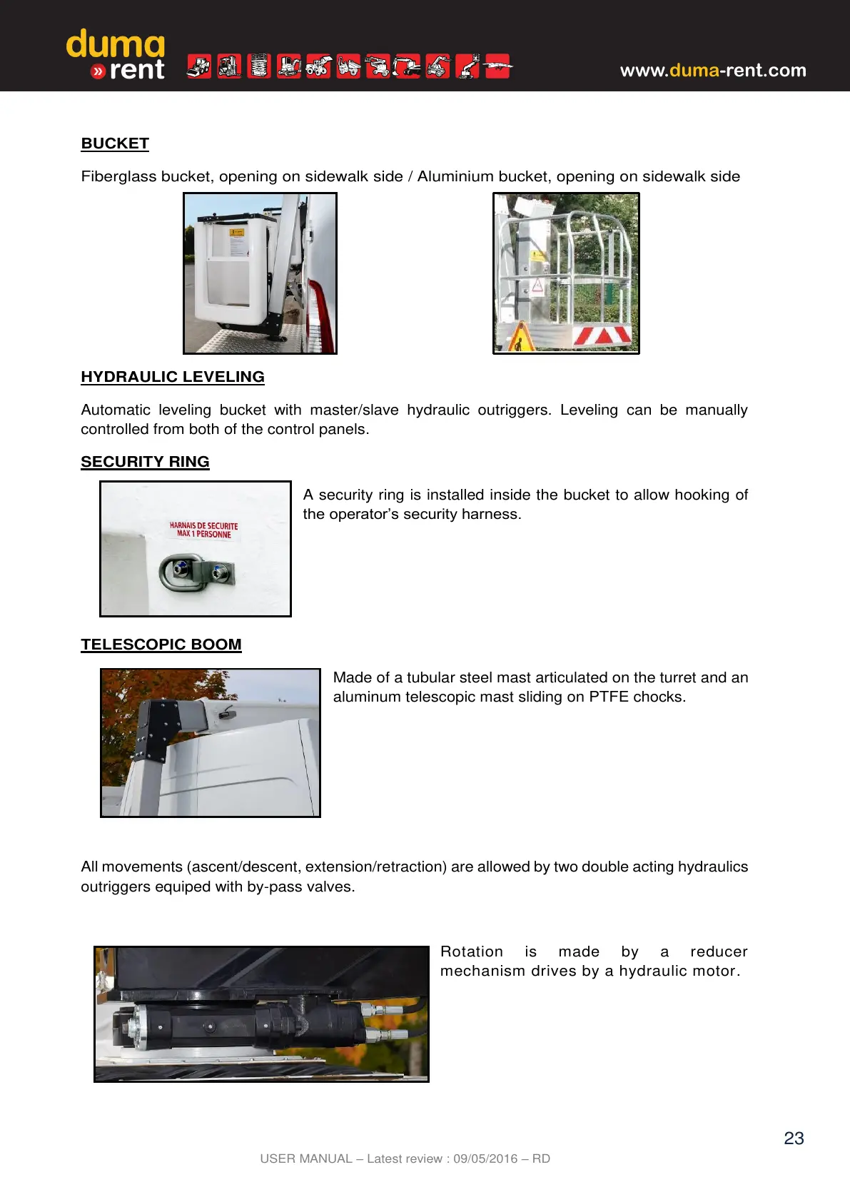 All movements (ascent/descent, extension/retraction) are allowed by two double acting hydraulics