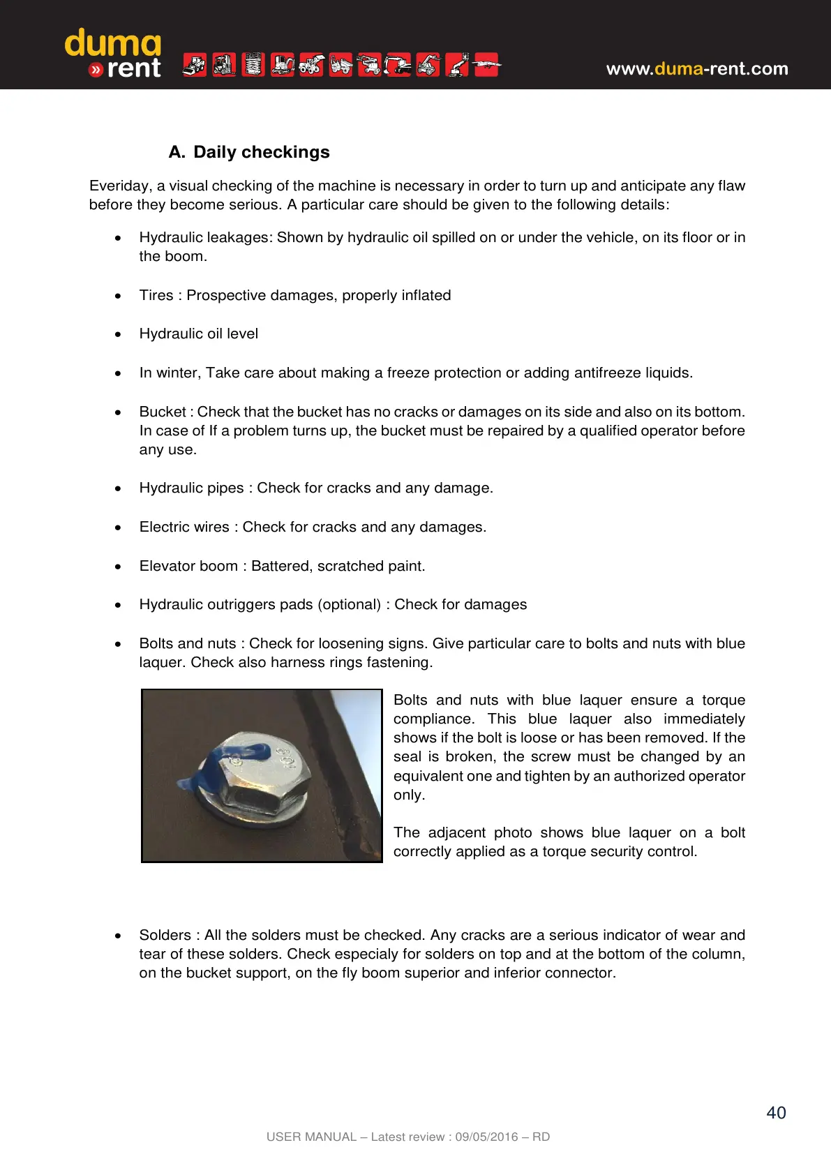 Bolts and nuts : Check for loosening signs. Give particular care to bolts and nuts with blue