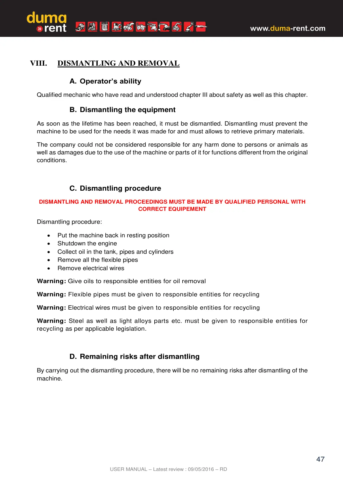 By carrying out the dismantling procedure, there will be no remaining risks after dismantling of the