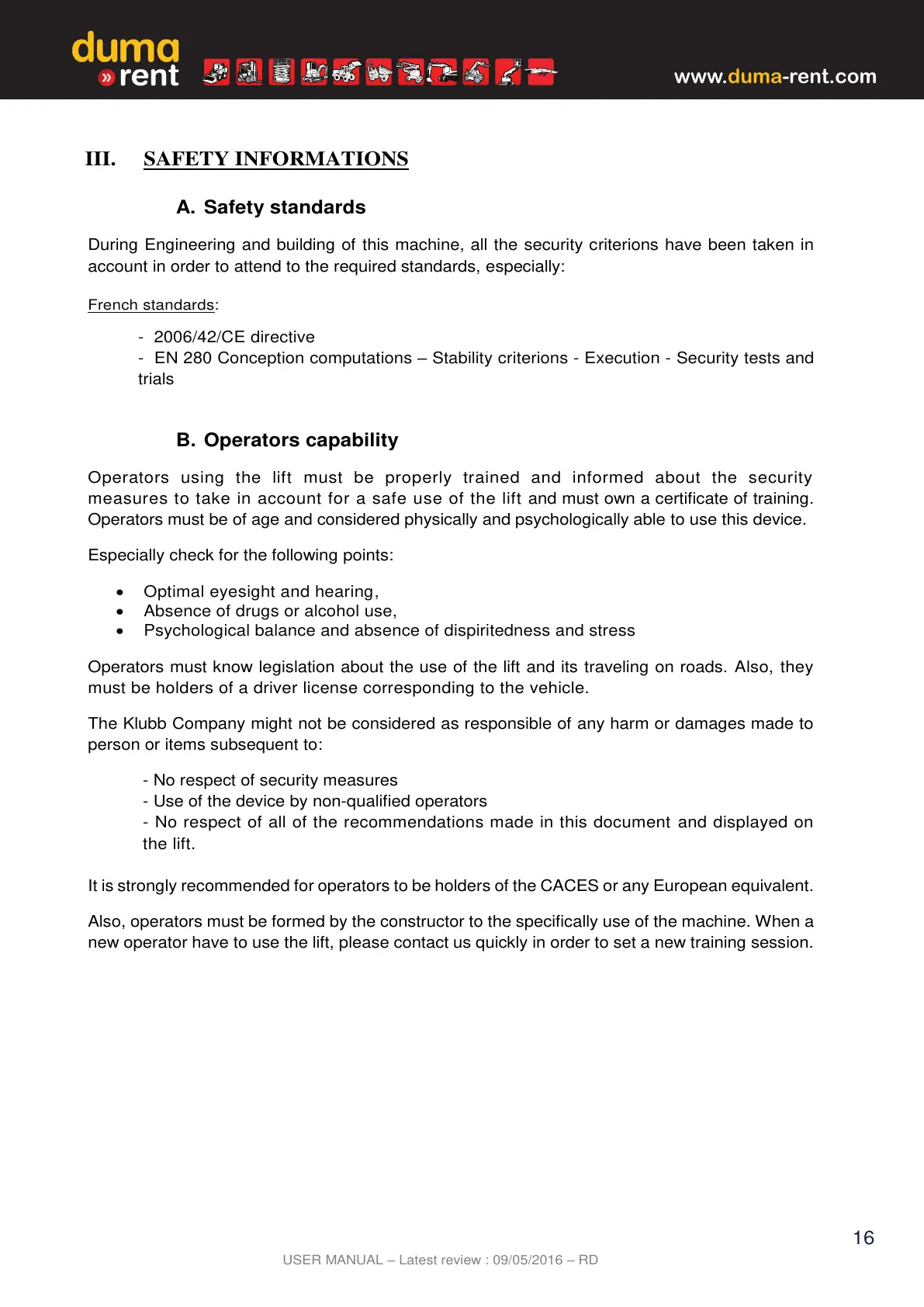 measures to take in account for a safe use of the lift and must own a certificate of training.