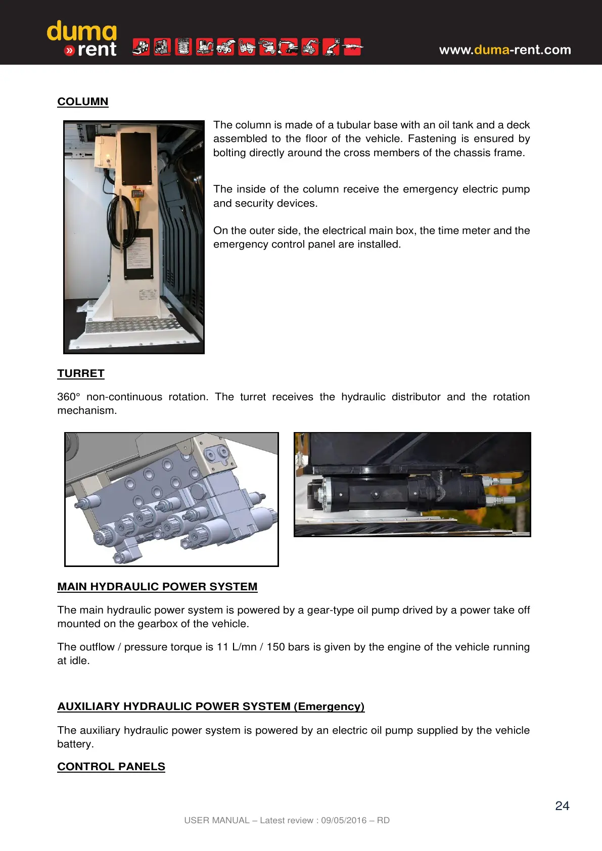 360° non-continuous rotation. The turret receives the hydraulic distributor and the rotation