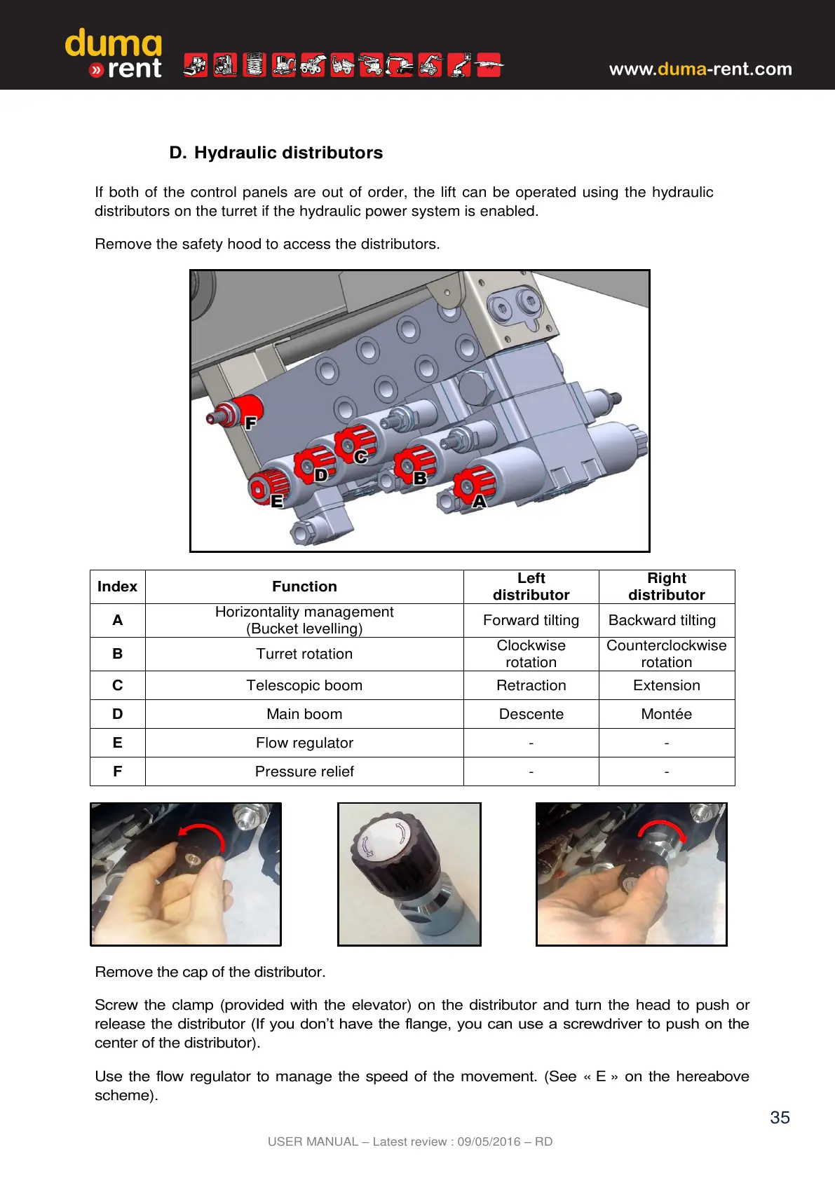 Use the flow regulator to manage the speed of the movement. (See « E » on the hereabove