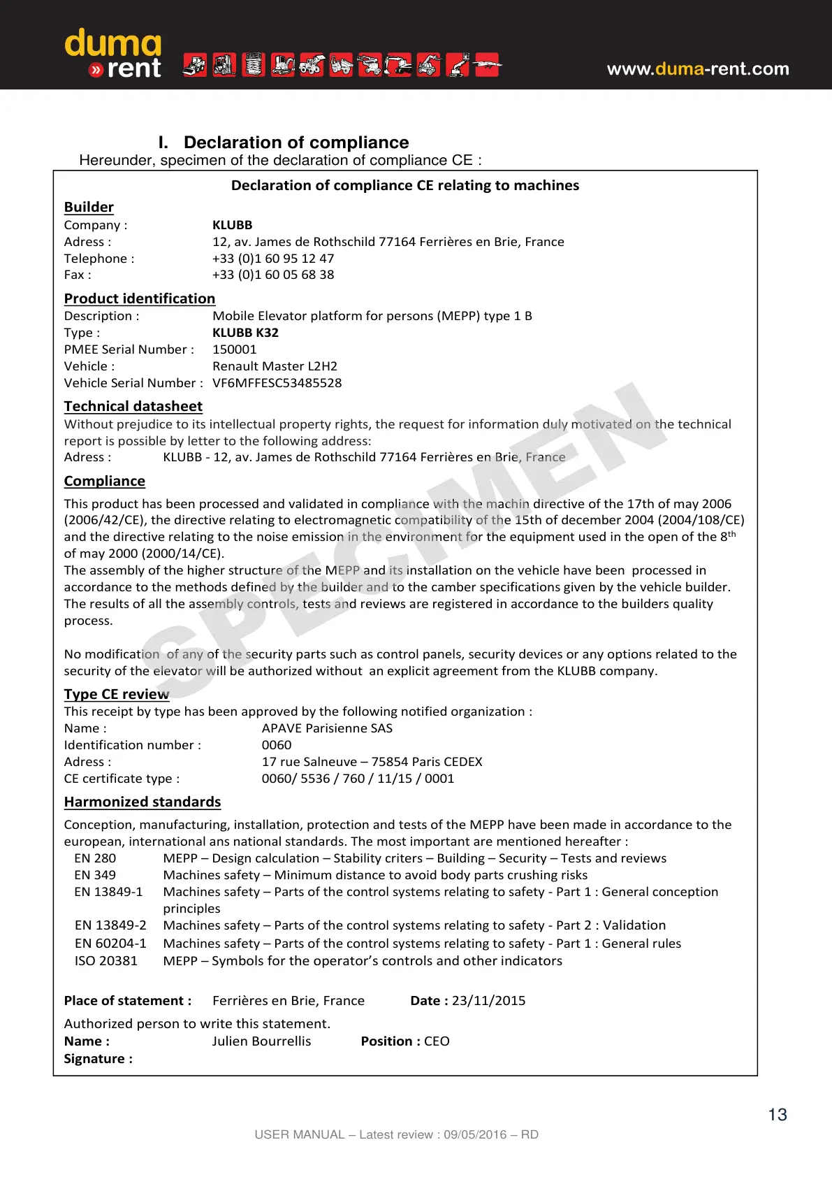 This product has been processed and validated in compliance with the machin directive of the 17th of may 2006