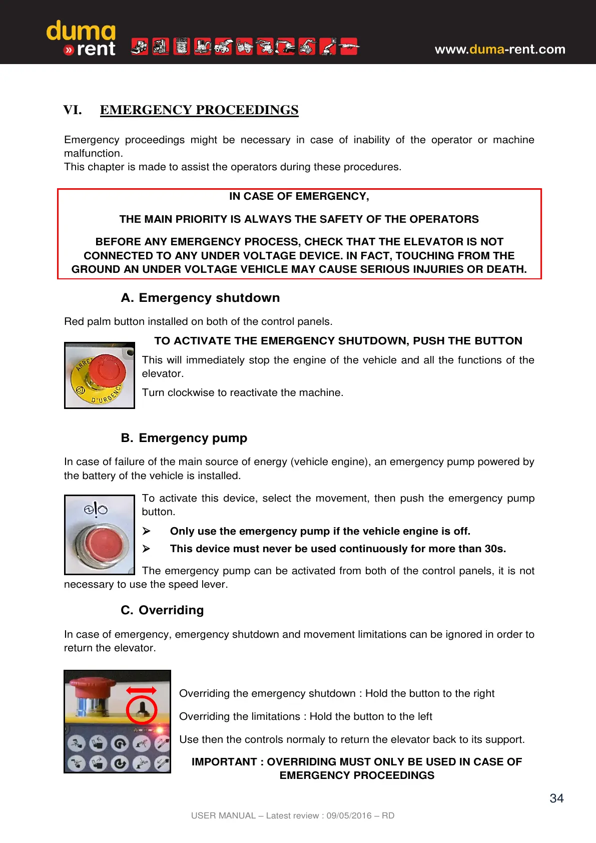 BEFORE ANY EMERGENCY PROCESS, CHECK THAT THE ELEVATOR IS NOT
