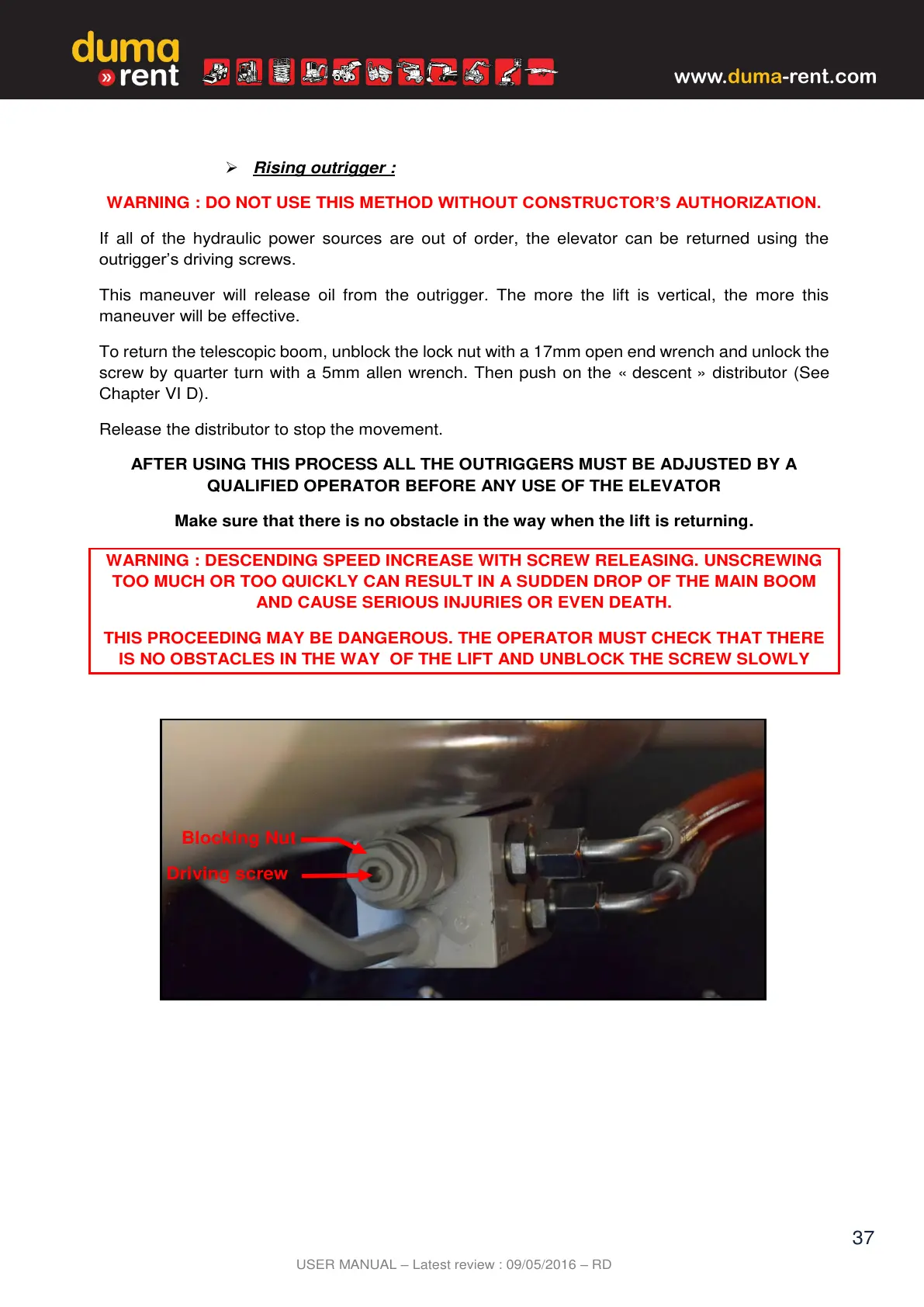 WARNING : DESCENDING SPEED INCREASE WITH SCREW RELEASING. UNSCREWING