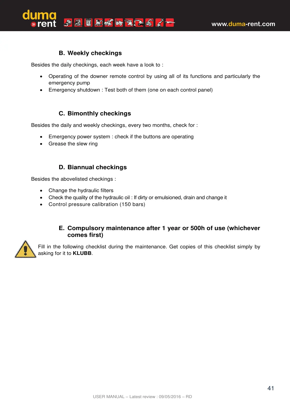 E. Compulsory maintenance after 1 year or 500h of use (whichever