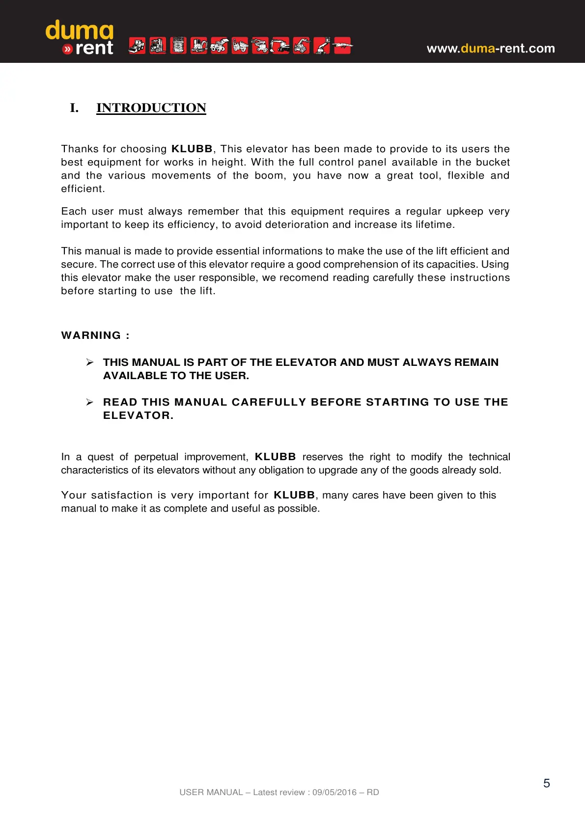 This manual is made to provide essential informations to make the use of the lift efficient and