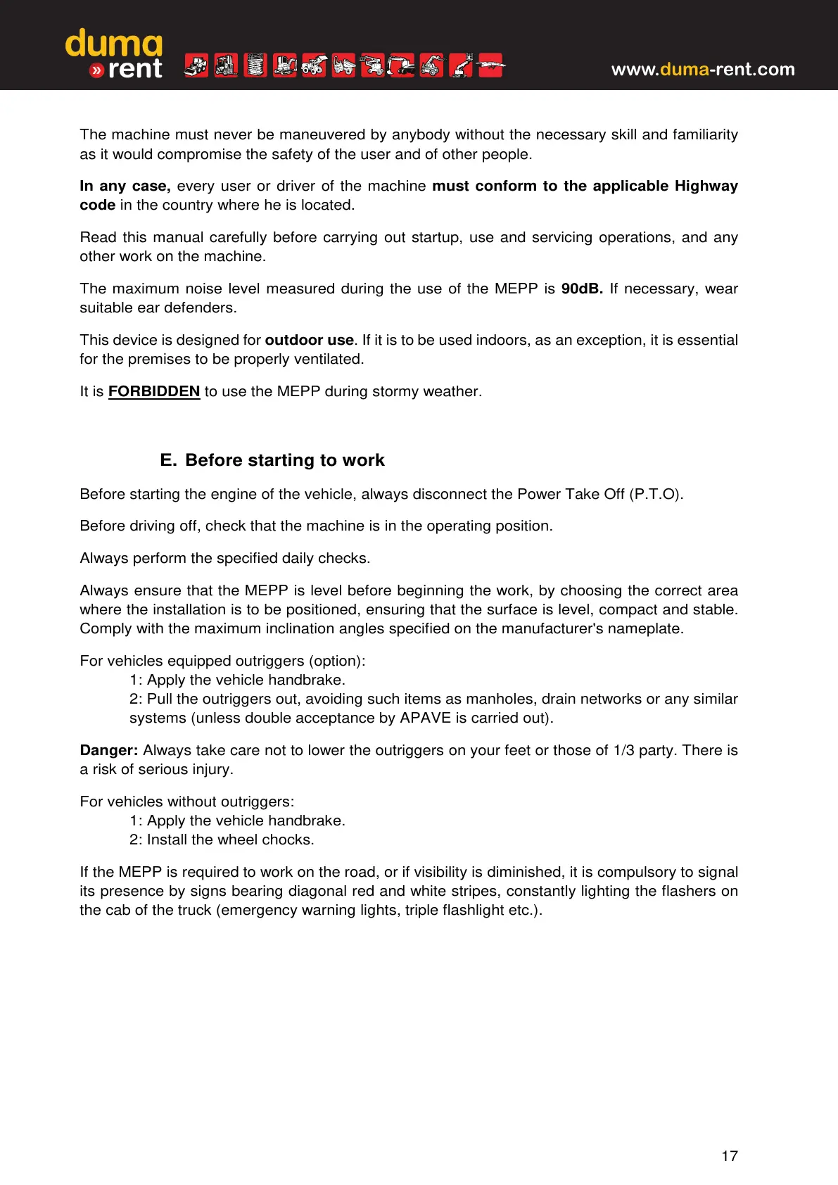 In any case, every user or driver of the machine must conform to the applicable Highway