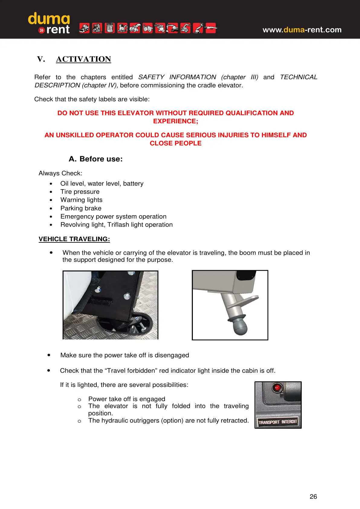 DESCRIPTION (chapter IV), before commissioning the cradle elevator.