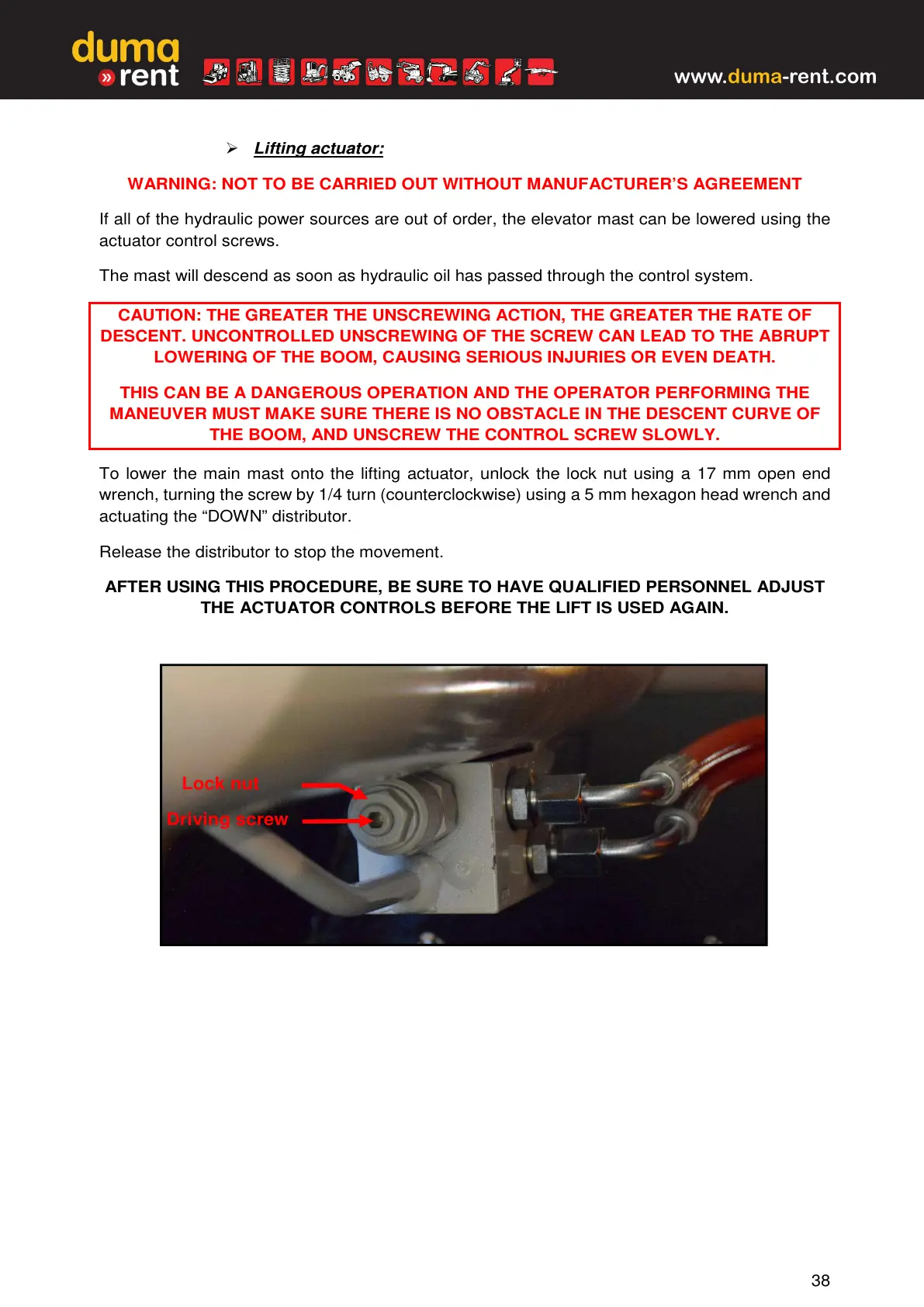 THE ACTUATOR CONTROLS BEFORE THE LIFT IS USED AGAIN.