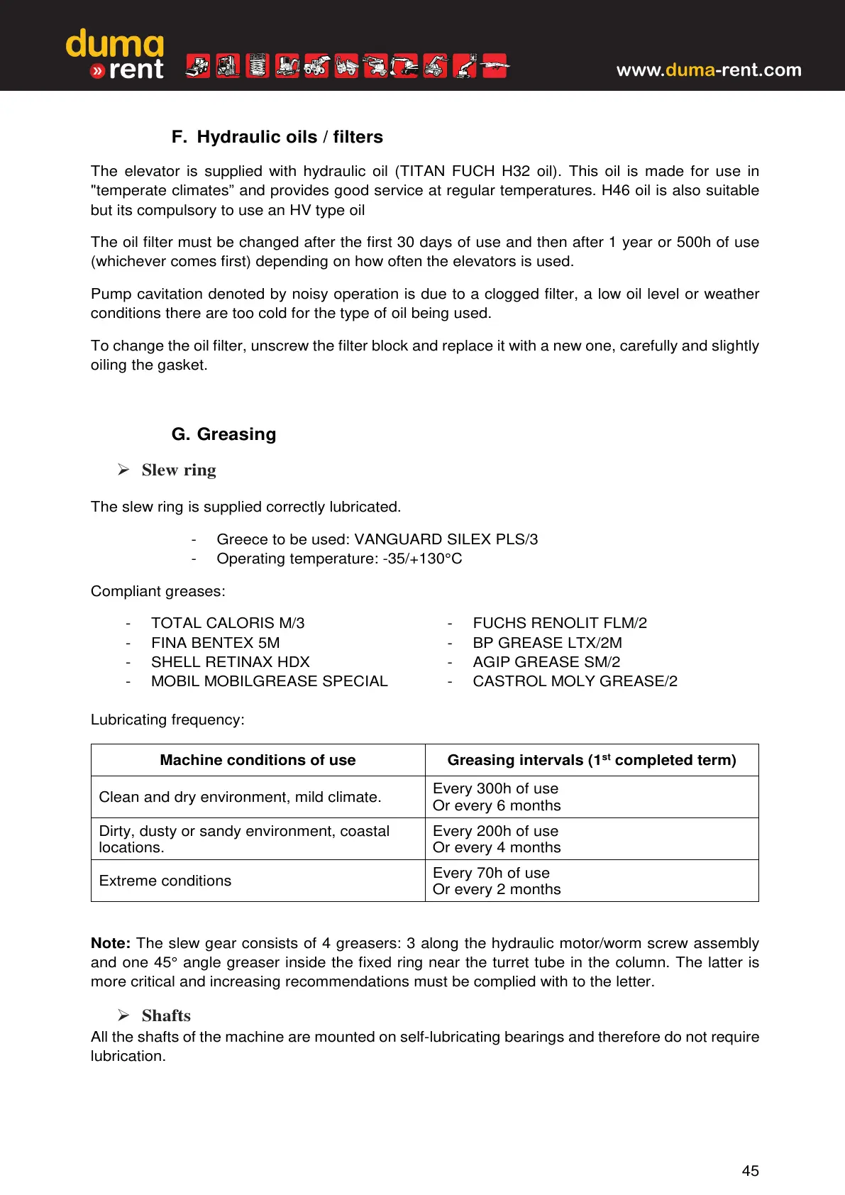 The elevator is supplied with hydraulic oil (TITAN FUCH H32 oil). This oil is made for use in