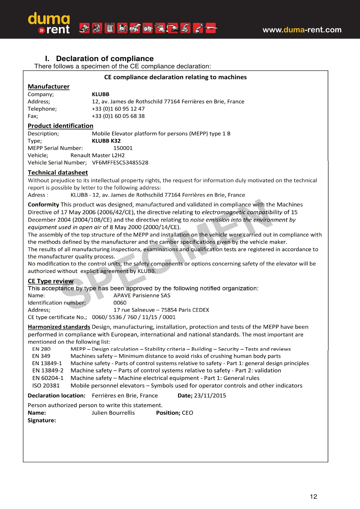 Conformity This product was designed, manufactured and validated in compliance with the Machines